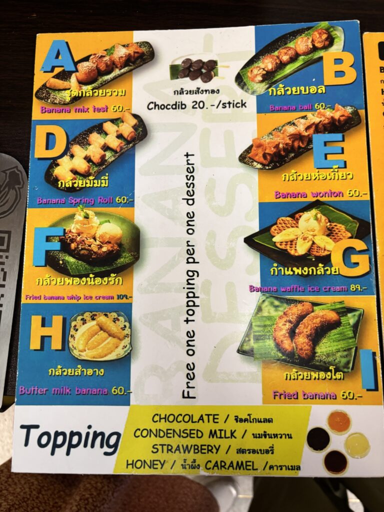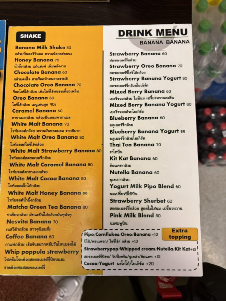予算は1人100バーツ(約450)程度で、バナナジュースは必ず試してほしい一品です。