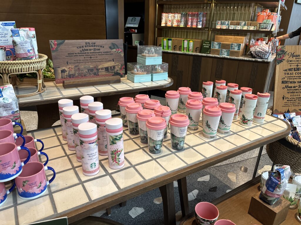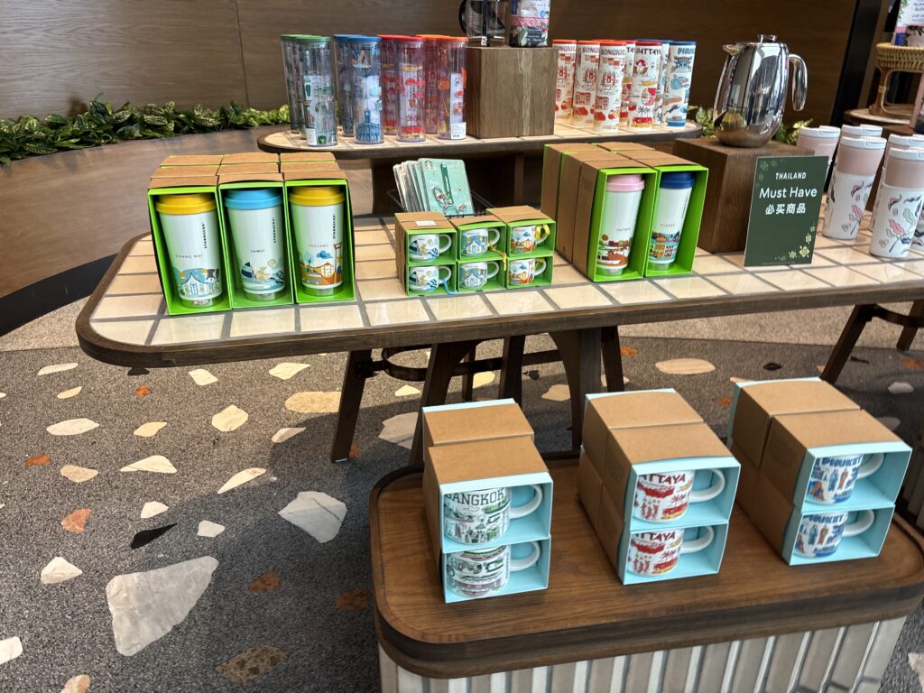 このスターバックスには、ここでしか手に入らない限定グッズが多数揃っています。タイらしいデザインのタンブラーやマグカップ、トートバッグなど、旅の記念やお土産にぴったり。